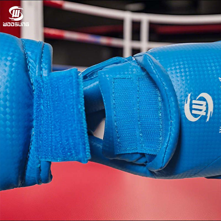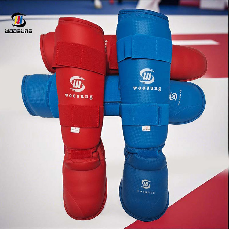 La apariencia presenta los colores rojo y azul clásicos de la competencia de kárate, acentuados con un bordado blanco "Wu" (artes marciales), que muestra la identidad profesional del atleta. Esto no es sólo un Karate con espinilleras hasta la rodilla, sino una extensión de tu confianza y personalidad en la alfombra de competición.