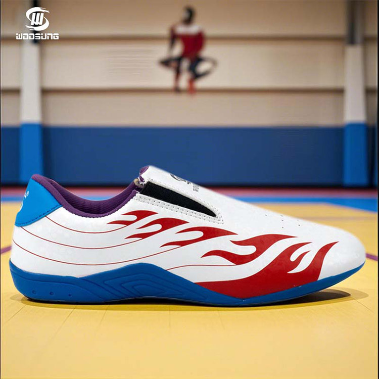 Los zapatos deportivos de Taekwondo de Woosung están diseñados específicamente para los exigentes requisitos de los practicantes de taekwondo. Con una elegante parte superior blanca adornada con vibrantes gráficos de llamas rojas y azules, estos zapatos no solo lucen impresionantes sino que también brindan un impulso de confianza en la alfombra. La marca Woosung es sinónimo de calidad e innovación, y estos zapatos no son una excepción.