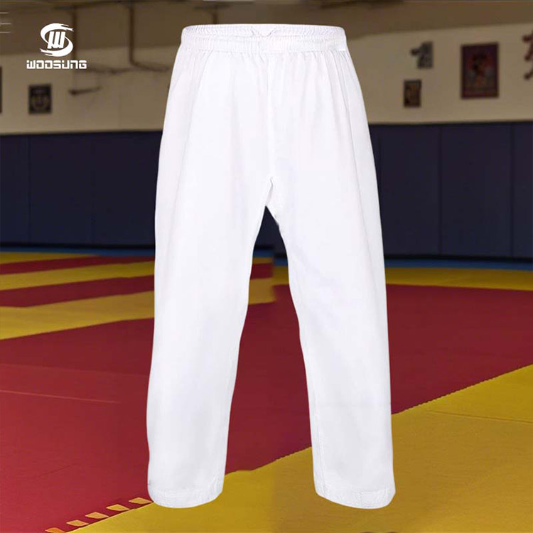 La prenda superior presenta un diseño clásico de cuello alto, que restaura la sensación digna de los uniformes de kárate tradicionales, al tiempo que optimiza la curvatura del cuello para evitar la fricción contra el cuello durante el entrenamiento. La tela de la chaqueta utiliza un material de mezcla de algodón y poliéster de alta calidad con un forro de malla transpirable, que combina transpirabilidad y propiedades de absorción de humedad. Incluso durante el entrenamiento de alta intensidad, mantiene la piel seca y reduce las molestias provocadas por la congestión. Los hombros y las axilas, como puntos clave de tensión, utilizan costuras de triple refuerzo, combinadas con las propiedades resistentes al desgarro del tejido de perlas, resistiendo eficazmente el estiramiento y la deformación, extendiendo la vida útil de la prenda. Se pueden agregar logotipos o nombres de dojo bordados personalizables en el cofre, mostrando un sentido de pertenencia a los jóvenes artistas marciales.
